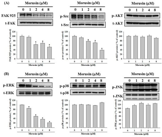 Effect of morusin on regulating the adhesion and MAPK signaling pathways. NPC-39 cells were treated with morusin (0–8 μM) for 24 h and cell lysates were subjected to Western blotting analysis to analyze the phosphorylation of: FAK, Src, and Akt for adhesion signaling (A); and ERK, JNK, and p38 for MAPK pathways (B). Densitometric analyses of kinase phosphorylation were conducted by ImageJ. * p < 0.05, compared with the vehicle group.