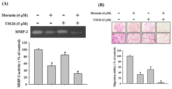 Since the Mitogen-activated protein kinases (MAPK) are involved in regulating MMP-2, which is known as a metastasis pathway [23,24], the effects of morusin on the expressions of MAPK pathway were investigated by Western blotting assay. The results demonstrate that morusin significantly inhibited the phosphorylation of FAK, Src, and ERK1/2 in the NPC-39 cell lines, while no effect on the phosphorylation of AKT, p38, and JNK1/2 was measured (Figure 5A,B). To verify whether the inhibition of MMP-2 activity by morusin was caused by the downregulation of phosphorylated ERK1/2, the effects of U0126, an inhibitor of the ERK1/2 signaling pathway, on the MMP-2 activity and cell migration for NPC-39 cells was examined. As shown in Figure 6A, B, the combination treatment of morusin (4 μM) and U0126 (5 μM) resulted in the intense inhibition of the MMP-2 activity and cell migratory ability in NPC-39 cells.