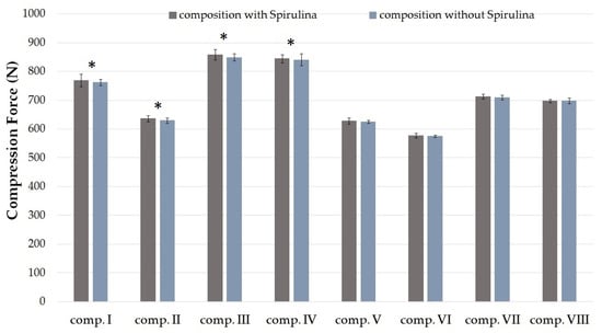 Texture analysis result of the SPP-containing compositions I–VIII (signified with gray columns) and compositions without SPP (signified with blue columns) at 25 °C, determined as compression force (N). Data are expressed as means ± S.D. and n = 5. Ordinary one-way ANOVA and Tukey’s multiple comparison test were performed to compare formulations with and without SPP and suspended and dissolved formulations. Significant differences are marked on the figure with * (p < 0.05). The application of Spirulina platensis powder did not statistically change the compression force values in any of the cases. Significant differences were detected between the suspended (I–IV) and the dissolved forms (V–VIII) in every pair of compositions.