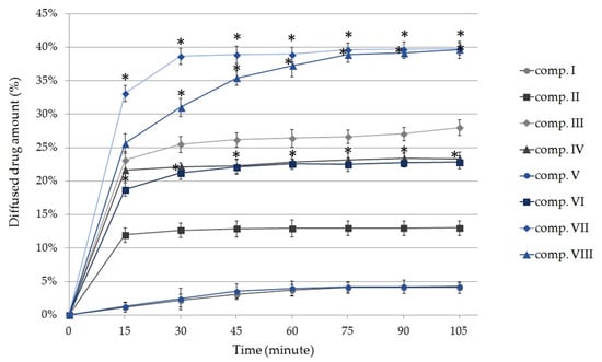 Phycocyanin release rate and the diffusion coefficient values related to the compositions (I–VIII). Each data point represents the mean ± S.D., n = 6, and p < 0.05. Ordinary one-way ANOVA and Tukey’s multiple comparison test were performed to compare suspended and dissolved formulations. Significant differences are marked with * in the table. Asterisks show the significance levels in the case of compositions containing SPP in suspended or dissolved forms.