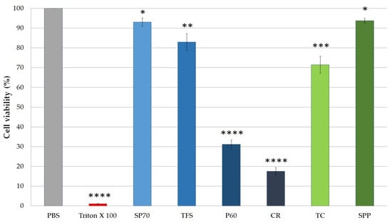 Cell viability evaluation following MTT assay on HaCaT cells treated with 0.50 (m/m)% solutions of sucrose ester SP 70 (SP70), Tefose 63 (TFS), Polysorbate 60 (P60), Cremophor A6 and A25 (CR), Transcutol HP (TC), and Spirulina platensis powder (SPP). Each data point represents the mean ± S.D. and n = 10. Cell viability is expressed as the percentage of negative control (PBS), which was treated only with PBS. The positive control was Triton X 100 (10% w/v), which had significantly lower cell viability results compared with the untreated control. Ordinary one-way ANOVA with Dunnett’s multiple comparison test was performed to compare the different solutions with PBS. The *, **, ***, and **** indicate statistically significant differences at p < 0.05, p < 0.01, p < 0.001, and p < 0.0001.