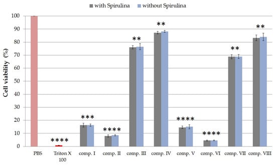 Cell viability test with the MTT assay on HaCaT cells after incubation of compositions I–VIII for 1 h. Cell viability is expressed as the percentage of negative control (PBS), which was treated only with PBS. The positive control was Triton X 100 (10% w/v), which had significantly lower cell viability results compared with the untreated control. Each data point represents the mean ± S.D. and n = 12. Ordinary one-way ANOVA with Dunnett’s multiple comparison test was performed to compare the different formulations with PBS. The application of Spirulina platensis powder did not statistically change the cell viability values in any of the cases. The **, ***, and **** indicate statistically significant differences at p < 0.01, p < 0.001, and p < 0.0001.
