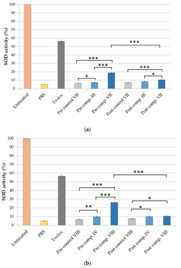 Effects of pre- and posttreatment with compositions containing Tefose 63 (comp. III, VII) (a) and sucrose ester SP 70 surfactant (comp. IV, VIII) (b) on superoxide dismutase (SOD) enzyme activity in HaCaT cells exposed to UVB irradiation. SOD activity is expressed as the percentage of SOD activity in untreated keratinocytes. UVB irradiated cells pretreated with PBS were used as negative control. As positive control, Trolox (Vitamin E derivate) (10.0 µM) dissolved in PBS was used in pretreatment. Data are expressed as the mean ± S.D. and n = 10. Ordinary one-way ANOVA and Tukey’s multiple comparison tests were performed to compare the formulations with each other. The *, **, and *** indicate statistically significant differences at p < 0.05, p < 0.01, and p < 0.001.