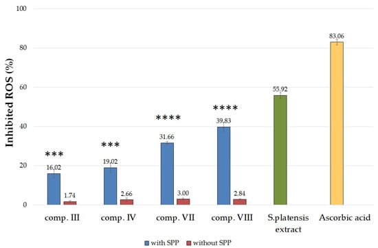 DPPH-scavenging activity of SPP-containing compositions compared with formulations without SPP. The positive control was S. platensis extract in a concentration 10 mg/mL and ascorbic (0.25 mg/mL) dissolved in ethanol (96%). As negative control, 2.0 mL of DPPH solution (0.06 mM) diluted with 1.0 mL absolute ethanol was applied. Data presented as mean ± SD (n = 4). Ordinary one-way ANOVA and Tukey’s multiple comparison test were performed to compare formulations with or without SPP. Significant differences are marked on the figure with *** and **** (p < 0.001 and p < 0.0001), showing the significance levels in the case of compositions containing SPP and the same composition without SPP. Significant differences were detected in every case between the formulations with SPP and without SPP.