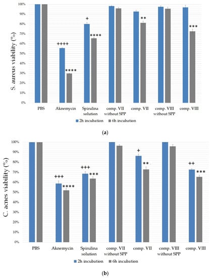 The broth microdilution method was used to estimate the antibacterial effect of compositions VII and VIII. The antibacterial tests were carried out for 6 h on S. aureus (Figure 7a) and C. acnes (Figure 7b) species. Aknemycin™ ointment (20 mg/g erythromycin) was used as positive control. The negative control group was treated with only PBS in both cases. The effect of Spirulina platensis was also tested separately in the form of a 0.25% solution made with PBS.