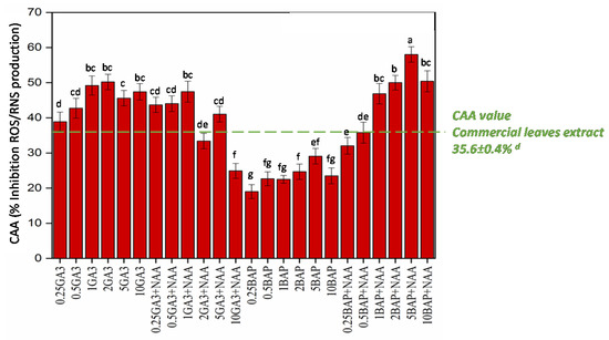 In vivo antioxidant potential of extracts from Thai basil callus cultures in response to different PGRs treatment and leaves measured by cellular antioxidant assay (CAA) estimated as inhibition % of ROS/RNS production. Values are means ± SD of three independent replicates. Different letters represent significant differences between the various experimental conditions (p < 0.05).