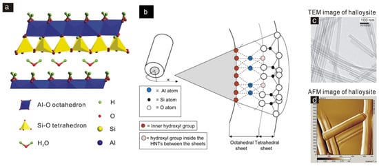 (a,b) HNTs crystal morphology and atomic structure; (c,d) Trasmission electron microscopy (TEM) and (Atomic force microscopy) AFM images of HNTs. Adapted with permission from [1,2].