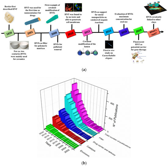 (a) A brief timeline for the development of HNTs; (b) Number of publications on HNTs sorted by year and for application. Data were collected from “Scopus”. The word “halloysite” is keyed into the “topic” search box (date of search: 22 September 2020). Adapted with permission from [11,12,13,14,15].