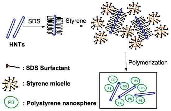Schematic representation of the in situ polymerization of styrene in the presence of HNTs. Reproduced with permission from [36].