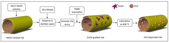 Recently, ZnO nanoparticles (ZnONPs) were immobilized onto HNTs’ surface by a one-pot synthesis (HNTs@ZnO) using, for the first time as Zn2+ precursor, the commercially available ZnONPs (possessing dimensions of ca. 100 nm) [55]. By adopting this procedure, supported ZnONPs with smaller dimensions (2.4 nm) than pristine ZnONPs were obtained. The characterization of the material showed that the HNTs@ZnO nanomaterial possessed an energy band gap value of ca. 2.65 eV, lower than that of pure ZnONPs (3.2 eV), highlighting a beneficial effect of HNTs on the photophysical properties of ZnO. The material developed was tested as photocatalyst for the degradation of organic dyes under visible light and as catalyst in the transesterification reaction of soybean oil to obtain biodiesel. In both reactions, the material showed good catalytic activity and recyclability.