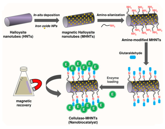 - Sillu, D.; Agnihotri, S. Cellulase Immobilization onto Magnetic Halloysite Nanotubes: Enhanced Enzyme Activity and Stability with High Cellulose Saccharification. ACS Sustain. Chem. Eng. 2020, 8, 900–913. [Google Scholar] [CrossRef]