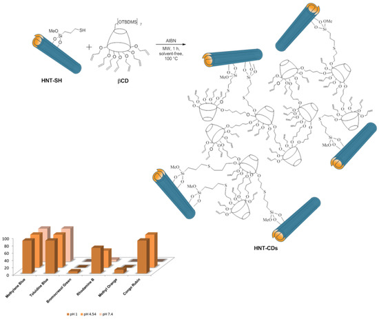 - Massaro, M.; Colletti, C.G.; Lazzara, G.; Guernelli, S.; Noto, R.; Riela, S. Synthesis and Characterization of Halloysite-Cyclodextrin Nanosponges for Enhanced Dyes Adsorption. ACS Sustain. Chem. Eng. 2017, 5, 3346–3352. [Google Scholar] [CrossRef]