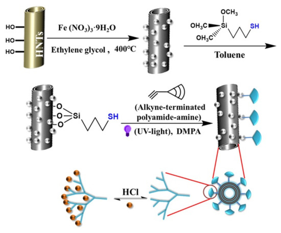 Preparation process of HNT@PDA@Fe(OH)3 nanohybrid. Reproduced with permission from [38].