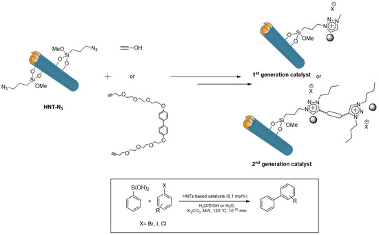 - Massaro, M.; Riela, S.; Cavallaro, G.; Colletti, C.G.; Milioto, S.; Noto, R.; Parisi, F.; Lazzara, G. Palladium supported on Halloysite-triazolium salts as catalyst for ligand free Suzuki cross-coupling in water under microwave irradiation. J. Mol. Catal. A Chem. 2015, 408, 12–19. [Google Scholar] [CrossRef]