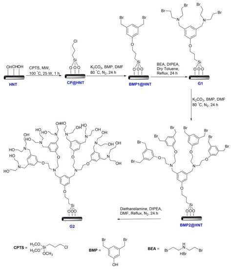 - Long, Z.; Wu, Y.-P.; Gao, H.-Y.; Li, Y.-F.; He, R.-R.; Liu, M. Functionalization of Halloysite Nanotubes via Grafting of Dendrimer for Efficient Intracellular Delivery of siRNA. Bioconjugate Chem. 2018, 29, 2606–2618. [Google Scholar] [CrossRef]