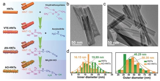 Following a similar approach, TiO2 nanoparticles were deposited onto HNTs’ external surface by Chen et al., by means of a one-step solvothermal method [46]. The authors employed the prepared nanomaterial for the photodegradation of methanol and acetic acid. The systems showed pH sensibility and high photocatalytic activity in the degradation of methanol, and high photocatalytic activity in the degradation of acetic acid, due to the few radical needs consumed during the degradation reaction.