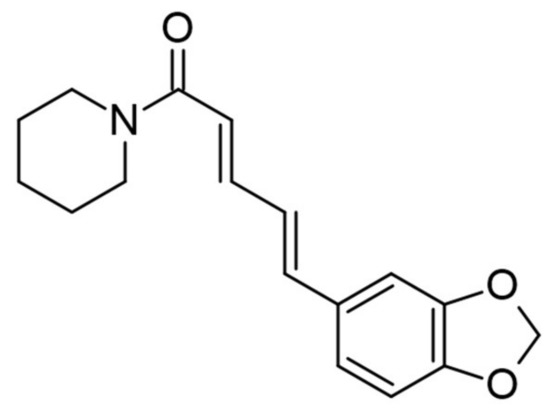 Piperine (PIP, (2E,4E)-5-(1,3-benzodioxol-5-yl)-1-piperidin-1-ylpenta-2,4-dien-1-one, Figure 6) is the primary pungent alkaloid of the plant Piper nigrum. Piperine has been used for centuries as a sternutatory agent, and possesses anti-oxidant, anti-inflammatory [67], analgesic [67], anticancer [68], anticonvulsant [69], antidepressant [70] and gastroprotective [71] effects. Piperine is also an agonist to the human capsaicin receptor TRVP1, which is a non-selective cation channel mainly expressed in the peripheral nervous system and of which activation is associated with the regulation of wide variety of biological responses including respiratory functions, body temperature, pain and glucose homeostasis [71,72]. Structure-activity relationship also suggests that due to its tertiary nitrogen (like in ACh), piperine can improve cognitive function in AD via the inhibition of AChE or by supporting the brain’s cholinergic system.