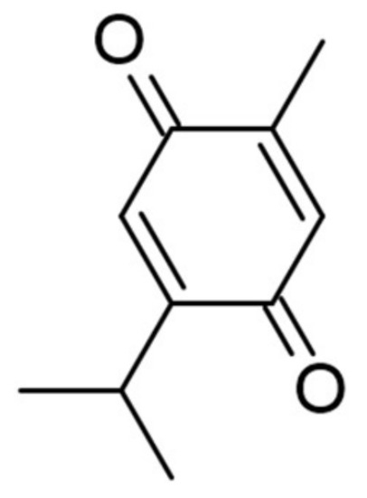 Thymoquinone (TQ, 2-isopropyl-5-methylbenzo-1,4-quinone, Figure 7) is the major active component of the fennel flower (Nigella sativa) [76], which was reported to exhibit anti-inflammatory, antioxidant, analgesic and immunomodulatory effects, as well as the potential to ameliorate symptoms of neurodegeneration and cognitive deficits [77,78,79].