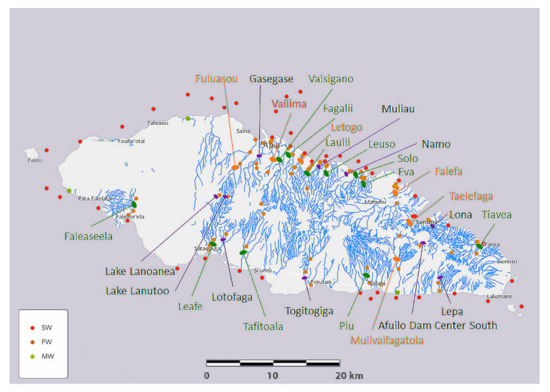 - Amosa, P.; Latu, F.; Imo, T.; Vaurasi, V. Preliminary water quality evaluation of the Vaisigano River, Samoa. Int. J. Adv. Sci. Eng. Technol. 2018, 6, 49–54. [Google Scholar]