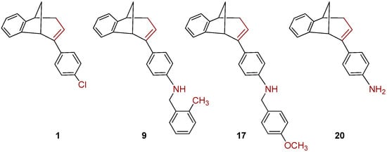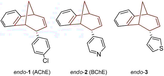 Recently we prepared photoproducts, shown in Figure 1, and probed the cholinesterase inhibition [,]. Compounds endo-1 and endo-2 were the most potent inhibitors of AChE (IC50 = 17.5 µM) and BChE (IC50 = 8.8 µM), respectively, among the tested compounds. All of the tested photoproducts exhibited a binding preference for BChE. In comparison to huperzine A, a selective BChE inhibitor (with similar basic methano-bridged aryl-bicyclo[3.3.1]octadiene skeleton), compound endo-2 was about five times more potent as a BChE inhibitor [].