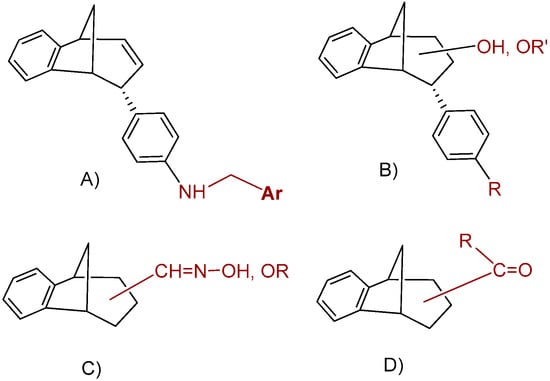 Functionalization of the benzobicyclo[3.2.1]octadiene skeleton employed in this study: (A) amines; (B) epoxides, alcohols and ethers; (C) oximes and oxime ethers; and (D) acyl derivatives.