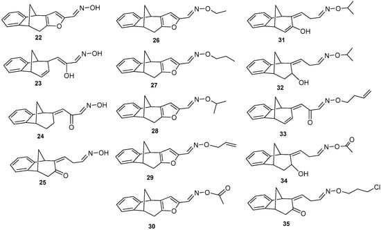 Further functionalization of the basic skeleton (Scheme 2) was performed according to the synthesis of the formyl derivative [], and a previously published study that combined docking and density functional theory []. From the formyl derivative 21, the corresponding bicyclic oxime 22 was synthesized as a crucial substrate for further synthesis of oxime ethers 22′. Along with the expected oxime 22 and oxime ethers 26–30, due to opening of the furan ring two classes were formed—opened oximes 23–25 and oxime ethers 31–35 (Figure 4).