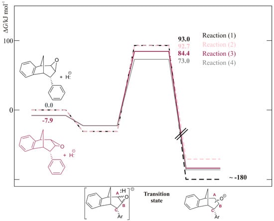 Thermodynamically, although the sum of free energies of reactants showed that an epoxide isomer with an oxygen above the plane was less stable compared to the other isomer (for 7.9 kJ mol−1), this ratio was inversed when an adduct between endo-38 and hydride formed: the adduct containing an isomer with an O above the plane becomes more stable (Figure 6). This makes the absolute barriers for the ring opening shown by reactions (1) and (2) even higher, being 123.9 and 124.2 kJ mol−1, respectively, leading to the conclusion that reactions (3) and (4), where the absolute barriers were 106.9 and 95.5 kJ mol−1, respectively, were favored. Due to the difference between activation energies for reactions (3) and (4) (Figure 6, full line), the product that was probably the most abundant in the mixture was a regioisomer of alcohol with an OH group at the CB atom and placed below the plane.