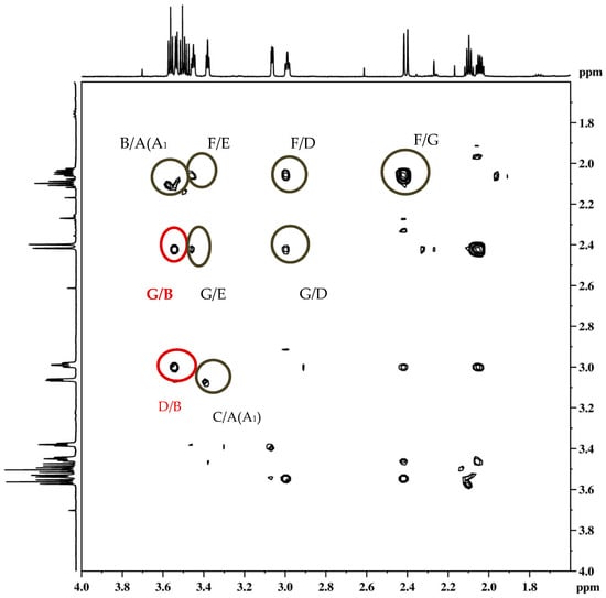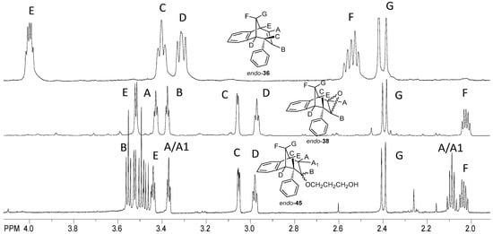 The signal at 3.54 ppm was a doublet for the proton E with the coupling constant of 4.8 Hz. The triplet and doublet at 3.07 and 2.99 ppm belonged to the signals of protons C and D with coupling constants of 5.0 and 4.1 Hz, respectively. Proton G showed a doublet at 2.41 ppm with a coupling constant of 10.8 Hz. The signal at chemical shift 2.05 ppm was a multiplet belonging to proton F. The difference between the signals of endo-38 and the corresponding ether endo-45 is the presence of an expected number of new signals in the aliphatic region for the new aliphatic chain as a substituent following the substitution of the hydroxy proton. The same tendency can be seen for the methoxy derivatives starting with photoproduct endo-37, corresponding epoxide endo-39 and ether endo-48 (Figure 11).
