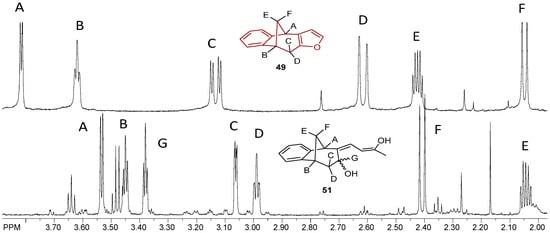 Partial 1H NMR spectra of starting compound 49 and the acylation product 51 with the opened furan ring.