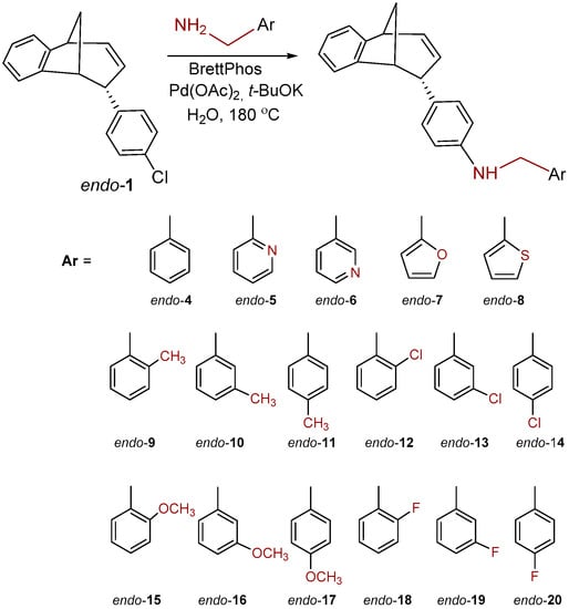 Chloro-substituted endo-1 (Scheme 1) was chosen as a suitable substrate for the Buchwald−Hartwig amination reaction. Compound endo-1 was obtained in one photochemical step according to the described method from the previously prepared o-vinylphenyl substituted butadienes []. The Buchwald−Hartwig amination successfully gave amino substituted benzobicyclo[3.2.1]octadienes endo-2–18 (Scheme 1) at 21–88% yields [].