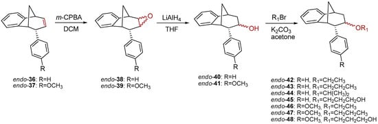 The ring opening was carried out by reacting epoxides endo-38 and endo-39 and LiAlH4 in tetrahydrofuran (THF; Scheme 3) as it is known that epoxides due to tension of the three-membered ring are highly reactive. The resulting products of the reaction with reducing agent were alcohols that can theoretically have four isomers: two regioisomers, and within them two more stereoisomers. According to the literature, the most likely isomer, resulting from the epoxide opening product, is a regioisomer with an hydroxy (OH) group on the middle carbon atom of the larger ring in the bridged bicycle system []. Finally, the conversion of alcohol into different ethers was carried out by a simple reaction of the alcohol with corresponding alkyl bromides and potassium carbonate in acetone (Scheme 3). The isolated products (20%–50% yields) were characterized by spectroscopic methods (see experimental and SI, Figures S1–S19).