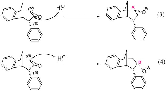 The epoxide opening step occurs upon the nucleophilic attack by a hydride anion at one of two carbons that belong to the epoxide ring: the middle carbon of the larger ring in the bridged bicycle system, denoted as B in Scheme 4, or the neighboring carbon atom denoted as A. A total of four reactions may occur, two starting from structures where the oxygen of epoxide is placed above the plane of the larger ring in the bridged bicycle system: