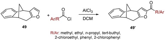 Benzobicyclo[3.2.1]octadiene photoproduct 49 [] with the annulated furan ring was the starting substrate (Scheme 6) for syntheses of the fourth group of compounds (Figure 2D). The Friedel–Crafts acylation reaction of 49 was performed with various carbonyl chlorides in the seal tube. During the reaction under applied conditions, in all cases the furan ring of 49 opened to give novel mono- or dihydroxy and mono- or dicarbonyl derivatives 50–57 (7–59%) with the characteristic benzobicyclo[3.2.1]-skeleton (Figure 13).