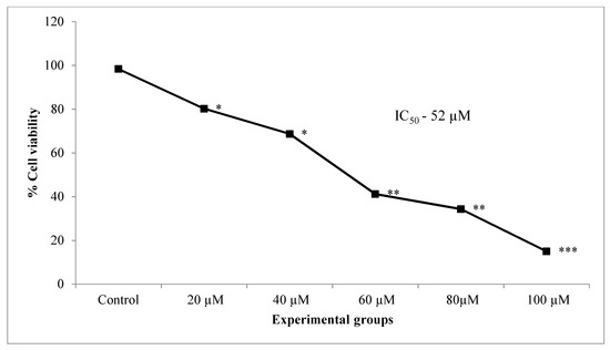 Effect of different doses of CA (20–100 µM) on the percentage cell viability of A549 lung cancer cells. Values presented as mean ± SE from independent duplicate experiments; n = 4. * p < 0.05, ** p < 0.01 and *** p < 0.001.