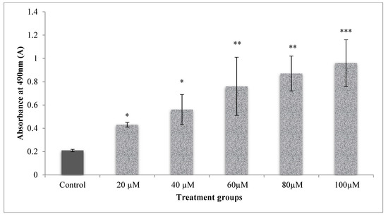 LDH leakage assay was used to assess the integrity of membranes determined through the estimation of LDH leaked in cell media due to the damaged membrane of cells, which in turn was measured at 490 nm. The cells which received CA at different doses (20–100 µM), significantly (p < 0.001) increased the cell membrane damage than the control cells (Figure 4). This reflected a dose-dependent increase in the cytotoxicity upon CA (20–100 µM) treatment. LDH levels measured are directly proportional to the cell’s damage.