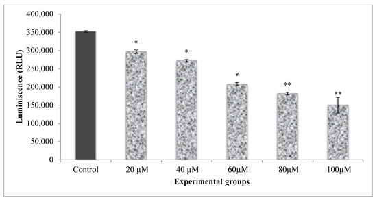 Dose-response analysis of CA on A549 cell proliferation as measured by cellular ATP. The amount of cellular ATP was estimated in terms of RLUs. A dose-dependant decrease in the ATP luminescence corresponding to the cell proliferation in CA treated A549 cells was observed. Values presented as mean ± SE from independent duplicate experiments; n = 4. * p < 0.05, ** p < 0.01.