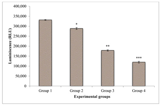 Effect of CA on cell proliferation of A549 cells in PDT of lung cancer cells. The amount of cellular ATP was estimated in terms of Relative Light Units (RLU). A dose-dependant decrease in the ATP luminescence corresponding to the cell proliferation in CA treated A549 cells was observed. Group 1 (Control), untreated cells; group 2, laser control (5 J/cm2); group 3 (PDT), PS (15 µM) + laser (5 J/cm2); group 4 (Phyto-PDT), CA (52 µM) + PS (15 µM) + laser (5 J/cm2); Values presented as mean ± SE from independent duplicate experiments; n = 4. * p < 0.05, ** p < 0.01 and *** p < 0.001.