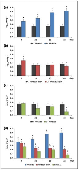 Survival of S. meliloti under water stress conditions. Bars show the average of viable cell counts (log10 CFU g−1) over time (7, 20, 30, and 40 days) using sterile sand as a matrix. Figures (a–c) show cell viability for Rm8530, Rm8530 expA, and Rm1021, respectively, under control (CT) and desiccation (DT) conditions. Figure (d) shows cell viability for each strain under desiccation over time. The error bars correspond to the standard deviations of five independent trials with three replicates each. According to Fisher’s LSD test (p ≤ 0.05), statistically significant differences between conditions (CT vs. DT; Figure a–c) for each point in time are indicated with asterisks, whereas statistically significant differences between strains are indicated with different letters (Figure d).