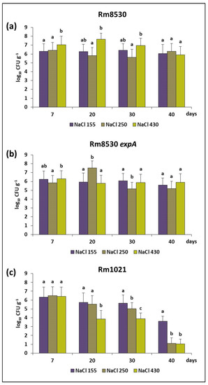 Survival of S. meliloti under saline stress conditions. Bars show the average of viable cell counts (log10 CFU g−1) over time (7, 20, 30, and 40 days) using sterile sand as a matrix, saturated with 155 mM, 250 mM or 450 mM NaCl solutions. Figure (a–c) show cell viability for Rm8530, Rm8530 expA and Rm1021, respectively. The error bars correspond to the standard deviations of five independent trials with three replicates each. According to Fisher’s LSD test (p ≤ 0.05), different letters indicate statistically significant differences between the three conditions for each point in time.