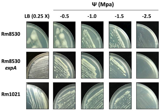 In terms of colony phenotypes, those corresponding to Rm1021 and Rm8530 expA were dry and opaque, with defined edges under all the conditions analyzed (Table 1, Figure 4). The characteristic mucoid and bright phenotype with undefined edges of the Rm8530 colony became dry when exposed to water potential reductions equal to or lower than −1.0 MPa (Figure 4). This could be related to a negative inhibition of EPS II-synthesis regulation. Similar results were obtained for R. meliloti EFB1, in which a significant reduction in the amount of secreted EPS resulted in mucoid loss in its colonies [32].