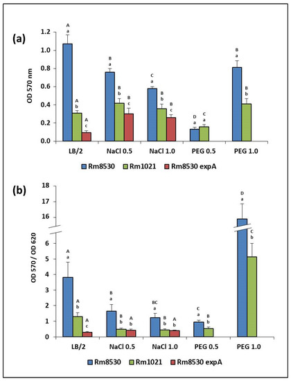 BFC was assessed both by quantifying bacterial adhesion to a polystyrene support (OD570) and estimating the biofilm/growth (B/G) ratio (OD570/OD620). The behavior of S. meliloti varied between the wild-type and mutant strains used here, as well as under different stress conditions. Although Rm8530 was generally better at biofilm forming than the other two strains under all conditions evaluated (Figure 5a,b), this ability decreased under saline stress, between 20% (under NaCl −0.5 MPa) and 40% (under NaCl −1.0 MPa) with respect to the medium without added solute (Figure 5a). This effect was particularly more marked for the conditions created by PEG −0.5 MPa, under which Rm8530′s BFC decreased almost 90% in comparison with non-stressful conditions. By contrast, salinity created by NaCl increased the BFC of the strains unable to synthesize EPS II (Rm1021 and Rm8530 expA) by ~50% with respect to the non-stressful conditions (Figure 5a). When the stress was caused instead by the non-diffusible solute (PEG), the behavior of Rm1021 varied. Its BFC was slightly lower under PEG −0.5 MPa than under non-stressful conditions, but similar to the values recorded under saline stress when PEG −1.0 MPa was used. For its part, Rm8530 expA was unable to form biofilm under PEG conditions in our experimental conditions.