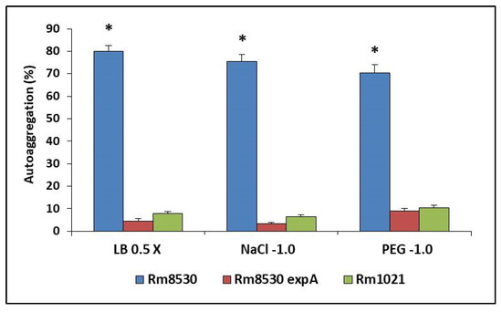 Quantitative autoaggregation assay of different S. meliloti strains under saline (NaCl) or matric (PEG) stress. The bars show the means of the autoaggregation percentages for Rm8530, Rm8530 expA and Rm1021, under NaCl- or PEG-induced water stress conditions (Ψ −1.0 MPa). The error bars represent the standard deviations from the means. Asterisks indicate statistically significant differences (p ≤ 0.05), according to Fisher’s LSD test.