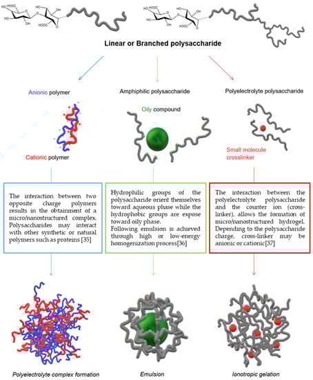 Polysaccharide-based micro/nanostructures for food and cosmetic applications are usually achieved by following three main methodologies (Figure 1), which exploit the chemical nature of polysaccharides by interaction with: