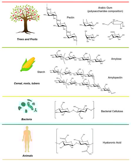 In the present review, an overview of the most exploited polysaccharides, their chemical and/or physical modification, and processes employed for the fabrication of micro/nanostructured devices for food and cosmetic applications is presented and discussed. A schematic representation of their structures and natural sources is provided in Figure 2 and Figure 3.