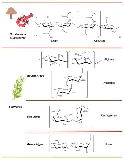 Marine organisms represent rich sources of structurally diverse biologically active compounds such as fatty acids, polysaccharides, essential minerals and vitamins, enzymes, pigments, and peptides with a promising cosmeceutical potential [71]. Unlike most natural sources exploited and discussed above, which are commonly farmed or produced, most marine natural sources exploited for food and cosmetic industries are abundant and generally considered as waste material [2,71]. Their possible exploitation to obtain high-value chemicals represents an important scientific challenge and ethical issue, particularly in the present period of strong economic, food, and worldwide environmental crises. The present paragraph reports a brief overview of the most promising polysaccharides obtained from marine organisms such as crustacean and seaweed (Figure 3).