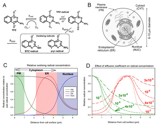TPZ enzymatic bioreductive metabolism under anoxia was assumed to be localised to particular regions (Figure 1C) to represent the ER (MDA-231WT and MDA-231ER cells), a region 1 µm inside the plasma membrane (MDA-231PM cells), the nucleus or the cytoplasm. The rate constant for this TPZ metabolism to the initial radical (kmet) was set to the values measured in each cell line (Table 1), scaled to the volume of the appropriate compartment, assuming a cell volume fraction in stirred cell suspensions at 5 × 105 cells/mL of 0.6 pL/mL. The rate constant for conversion of the TPZ radical to the DNA damaging radical (kelim) was set to 100 s−1 and the rate constant for loss of the damaging radical (kloss) was set to 104 s−1 consistent with rates determined by pulse radiolysis [14,15]. All radical reactions were assumed to occur homogeneously throughout the cell and radicals were assumed to be permeable to the nucleus but impermeable to the plasma membrane. The diffusion coefficient of all species in cytoplasm was set initially to 4 × 10−7 cm2·s−1 based on the diffusion coefficient of TPZ in HT29 multicellular layers [74]. Given that this value may be influenced by paracellular transport and by plasma membrane barriers, its applicability is uncertain so further simulations were performed using a range of values of D.