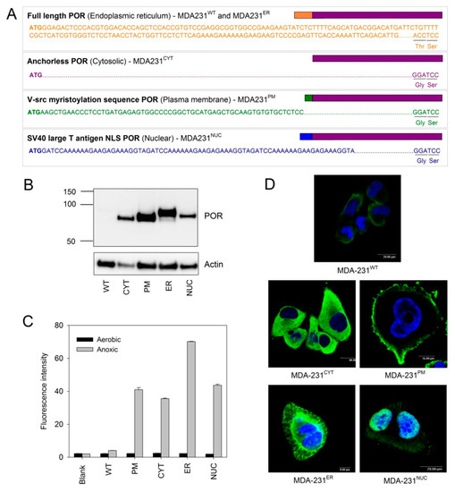 Generation of clonal MDA-231 cell lines expressing POR in different subcellular locations: (A) Details of the localization sequences used to direct POR to different subcellular compartments; (B) Western blot analysis showing expression levels and size differences of POR in the transfected cell lines; (C) Flow cytometry detection of POR enzyme activity in the transfected cell lines with an oxygen-sensitive fluorogenic POR substrate (FSL61). Results are the median fluorescence intensity of triplicate samples ± SEM. Blank is cell-free control; (D) Immunofluorescence microscopy showing the location of POR expression (green) in the MDA-231 cell lines. Nuclei are stained blue (Hoechst 33258).