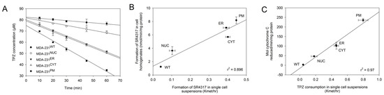 Parental and transfected cells were assessed for their ability to metabolize TPZ under anoxic conditions (Figure 3A). A concentration of 100 µM TPZ was selected to ensure first order non-saturable metabolism, as determined in previous studies [41]. Rates of TPZ consumption in single cell suspensions had rate constants (kmet) of 0.042 h−1 (MDA-231WT), 0.180 h−1 (MDA-231NUC), 0.457 h−1 (MDA-231ER), 0.461 h−1 (MDA-231CYT) and 0.796 h−1 (MDA-231PM); the greatest rates were therefore observed in cells expressing POR at the plasma membrane and lowest rates observed in cells expressing POR in the nucleus. The differences in rates in MDA-231PM and MDA-231NUC cells could reflect differences in POR catalytic activity or they could reflect limited diffusion of TPZ into the nucleus. To distinguish between these possibilities, rates of anoxic formation of the mono-N-oxide metabolite SR4317 (a non-toxic two-electron reduction product) in single cell suspensions were compared with SR4317 metabolite formation in whole cell homogenates (Figure 3B). The correlation (r2 = 0.896) suggests that differences in rates in intact cells are due to differences in the levels of POR expression and not a result of prodrug gradients. To confirm this, the activity of POR was measured using the cytochrome C reduction assay and plotted against the rate of TPZ consumption in single cell suspensions: A strong correlation (r2 = 0.97) was observed between these parameters (Figure 3C).