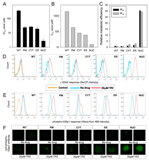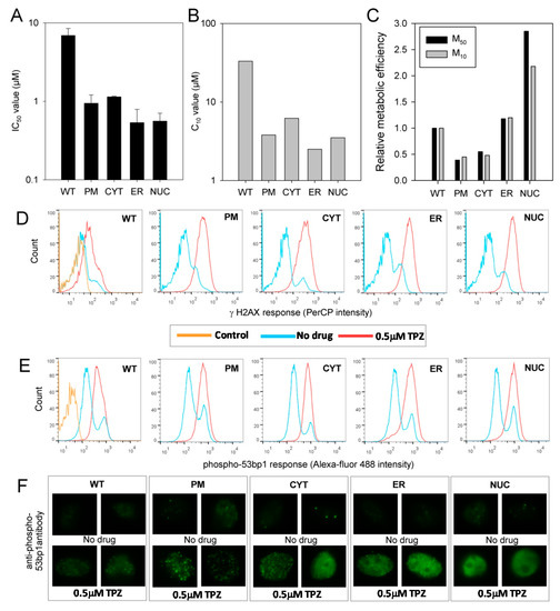 TPZ can achieve DNA damage under anoxia irrespective of the subcellular compartment of activation: (A) Sensitivity of parental and transfected MDA-231 cell lines to TPZ under anoxic conditions as determined by antiproliferative assay. IC50 values show the mean of 2–3 independent experiments, error bars show the SEM; (B) Sensitivity of parental and transfected MDA-231 cell lines to TPZ under anoxic conditions as determined by clonogenic assay. The concentration of TPZ required to reduce clonogenic survival by 90% (C10 values) were calculated in triplicate per drug concentration; (C) Relative metabolic efficiency in MDA-231 transfectants (extent to which metabolism contributes to cytotoxicity). M50 = 1/(IC50 × kmet) of anoxic TPZ metabolism as derived from Figure 2A. M10 = 1/(C10 × kmet) of anoxic TPZ metabolism as derived from Figure 2A. The M50 and M10 values were normalized to the value for MDA-231WT cells; (D) Flow cytometry analysis of γ-H2AX levels in parental and transfected MDA-231 cells following a 4 h anoxic exposure to 0.5 µM TPZ and a 1 h drug-free recovery period under aerobic conditions. Control: no antibody labelling; (E) Flow cytometry analysis of phospho-53bp1 levels in parental and transfected MDA-231 cells following a 4 h anoxic exposure to 0.5 µM TPZ and a 1 h drug-free recovery period under aerobic conditions. Control: secondary antibody only; (F) Immunofluoresence microscopy showing phospho-53bp1 foci formation following a four-hour anoxic exposure to 0.5 µM TPZ and a 1 h drug-free recovery period under aerobic conditions.
