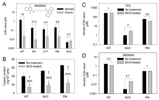 We hypothesized that the presence of metal ions may contribute to this toxicity. To examine this possibility we used the cell-excluded copper chelator bathocuproine (BCS) to deplete copper in MDA-231 cells prior to TPZ treatment. Following chronic exposure to BCS for 7 days (100 µM for 4 days followed by 300 µM for 3 days) total cellular copper content was measured by ICP-MS analysis with reference to a copper standard curve. MDA-231WT, MDA-231NUC and MDA-231PM cells all showed a similar response to BCS exposure with a ~64% decrease in copper content (Figure 6B). Cells were next exposed to 300 µM BCS for 7 days prior to determining their sensitivity to TPZ (Figure 6C) or SN26955 (Figure 6D) under aerobic conditions by antiproliferative assay. No change in aerobic sensitivity was observed in MDA-231WT or MDA-231PM cells to either drug following BCS exposure. In contrast, MDA-231NUC cells were 3-fold less sensitive to TPZ (Figure 6C) and 6.7-fold less sensitive to SN26955 (Figure 6D) after BCS treatment.